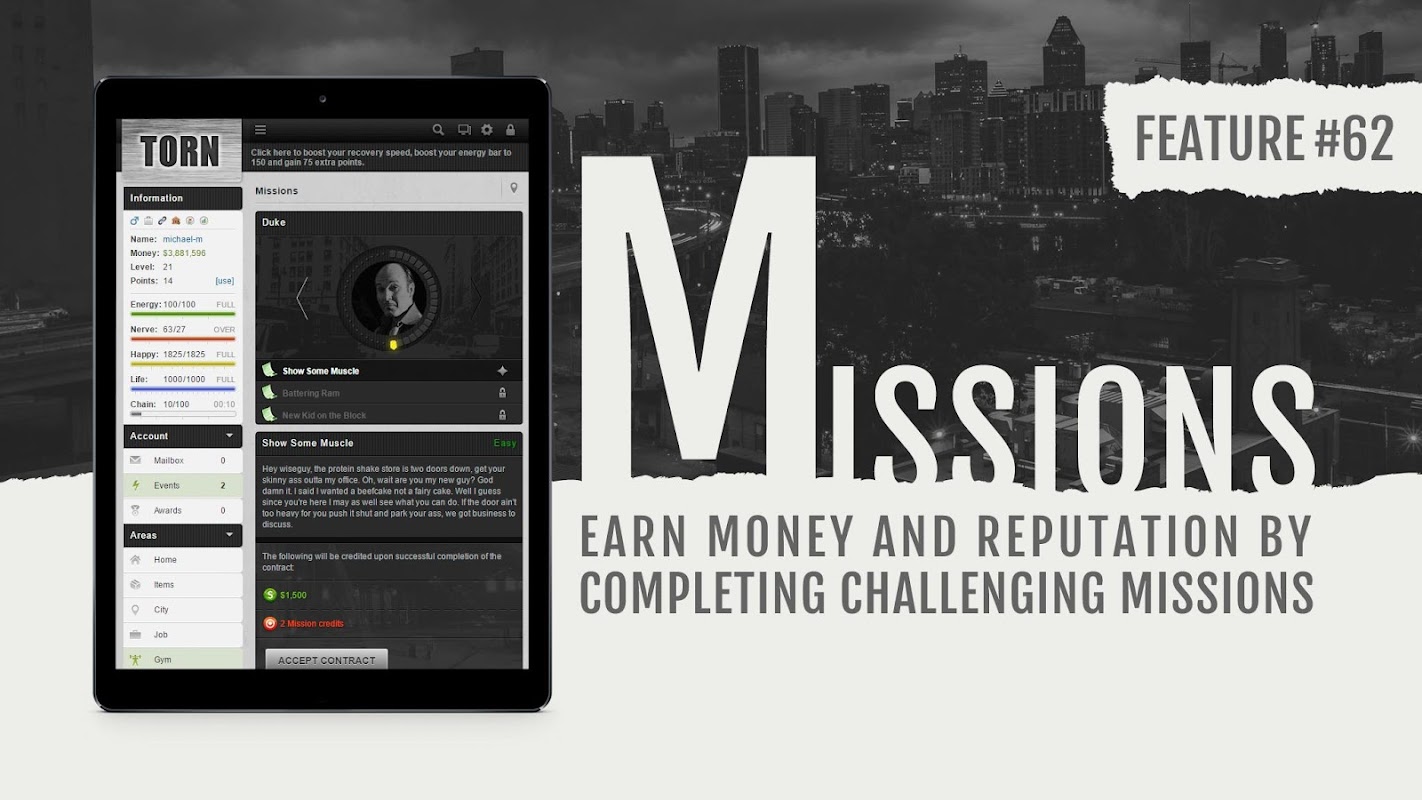 你即将进入“Torn City”;一座黑暗肮脏的大都市,居住着两百万真实居民,他们参与虚拟犯罪、征服、商业等等。在这款基于文字的开放世界角色扮演犯罪游戏中,你可以扮演任何你想扮演的角色,无论是恶霸、商人还是野蛮人,只要你有足够的智慧和子弹。