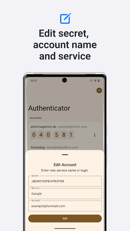 TOTP Authenticator 会生成 6 位 TOTP 验证码。网站(例如 Arbeitsagentur、NextCloud 等)会要求输入这些验证码。这项安全功能称为双因素身份验证 (2FA)。