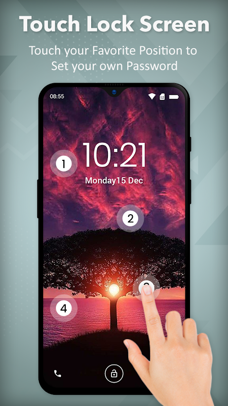 照片触摸位置密码:触摸锁屏应用程序是专为移动安全目的而设计的现代屏幕锁。您可以通过设置触摸密码来保护您的手机。您可以通过触摸 2-4 个位置来设置触摸密码。