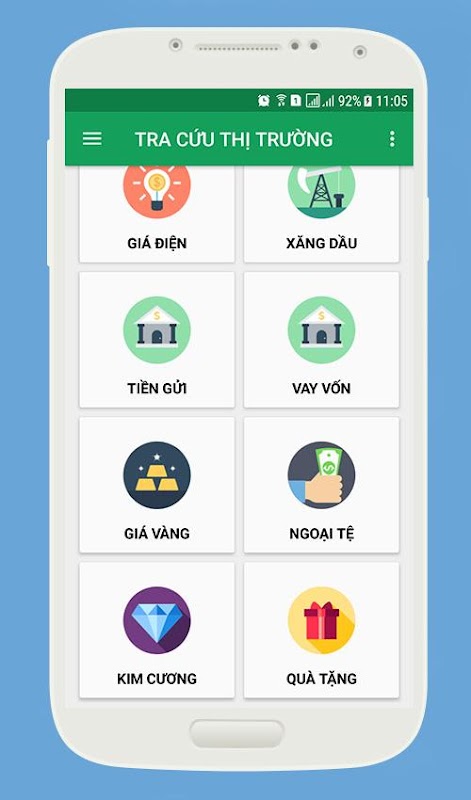 Ứng dụng Tra Cứu Thị Trường giúp bạn tra cứu nhanh thông tin về giá nông sản (cà phê, hồ tiêu, hạt điều...), giá vàng, giá điện, giá xăng dầu, giá thủy sản, tỷ giá ngoại tệ, giá kim cương, lãi suất tiền gởi, lãi suất tiết kiệm.
