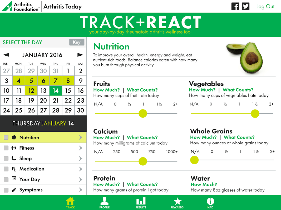 Discover the impact of your daily activities on your arthritis pain with TRACK + REACT. Track your nutrition, fitness, sleep, medication and mood and compare it to your arthritis pain in the Arthritis Impact graph.