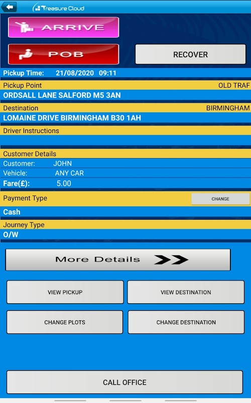 Treasure Cloud Driver App允许驾驶员接收和管理预订以及以下功能