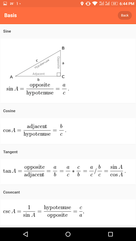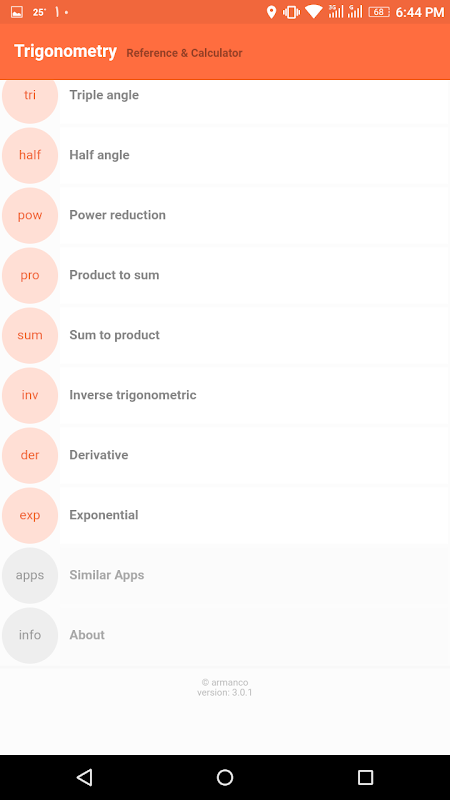 这个程序有两个部分,第一个是一个完整的三角函数计算器,另一个是三角恒等式和公式的完整列表。