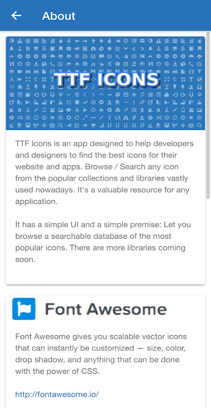 TTF Icons是一款旨在帮助开发人员和设计人员为其网站和应用程序找到最佳图标的应用程序。浏览/搜索当今广泛使用的流行收藏和图书馆中的任何图标。对于任何应用程序来说,这都是宝贵的资源。