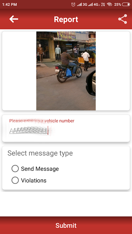 Step 1 -> take a photo of someone driving a motorcycle without a helmet, triple riding, wrong-side driving, using mobile while driving, etc. using our app, ensure the vehicle's license plate is clearly visible.
