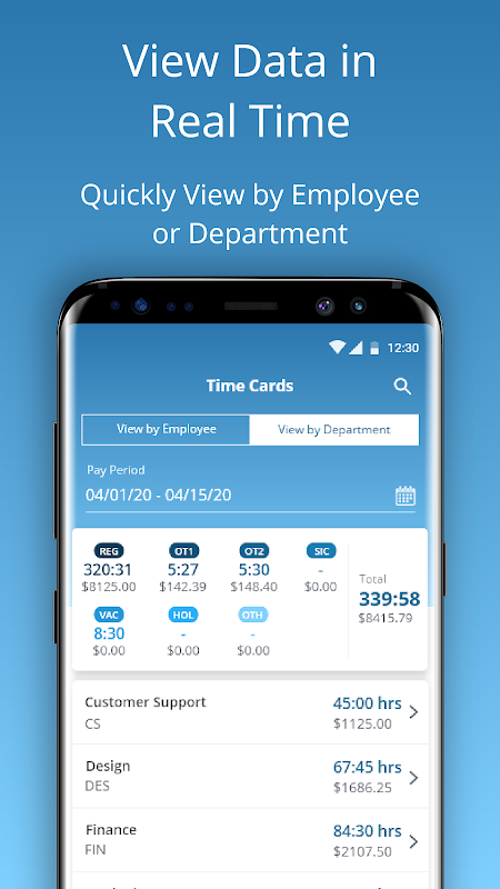 在您的帐户中,您可以按员工或部门进行过滤以返回结果。搜索员工以显示总薪水,加班费,福利时间等。通过电子邮件发送所有员工的时间卡摘要,并在发送前添加注释。作为管理员,您可以通过应用程序编辑打卡,方便组打卡,批准时间卡,甚至直接与支持人员联系。如果您在事后更改工资期限,则也可以重新计算时间表。