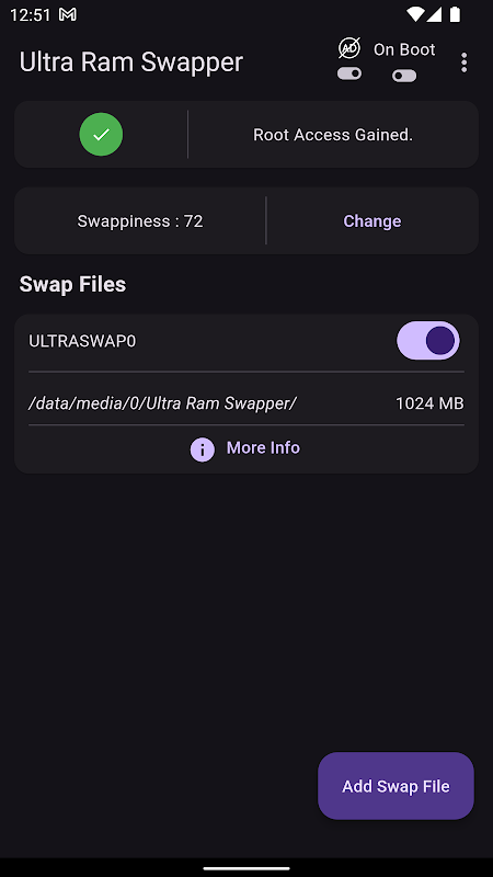 一个应用程序,可以轻松创建、启用/禁用和删除 root android 中的多个交换文件(虚拟内存)。