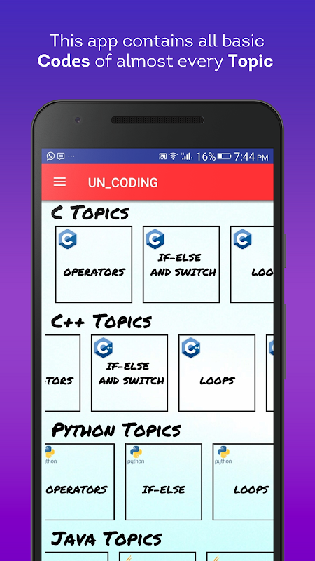 “了解编码” 的应用程序是为那些,谁知道编码的语法,但不知道在哪里以及何时使用这种语法。有时候,我们需要更多的实践来了解编码。在这个应用程序,几乎所有的编程语言(C,C ++,Python和Java)的重要议题已经被我们所覆盖。很少的代码在那里为编程语言的每一个话题,这将有助于编码器建立的逻辑进行编码。