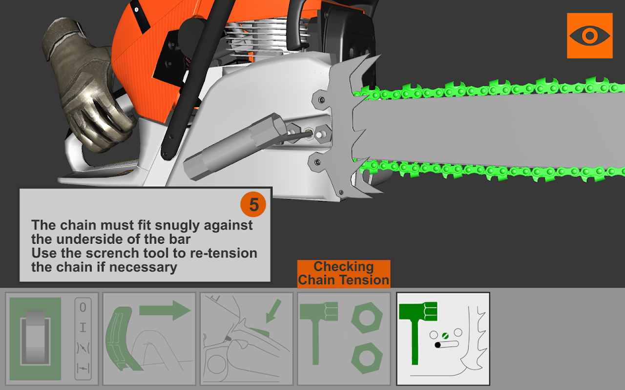 This App. teaches the user certain key chainsaw operations in interactive 3D, i.e. starting the engine, using the chain brake, changing engine oil and checking the chain tension.