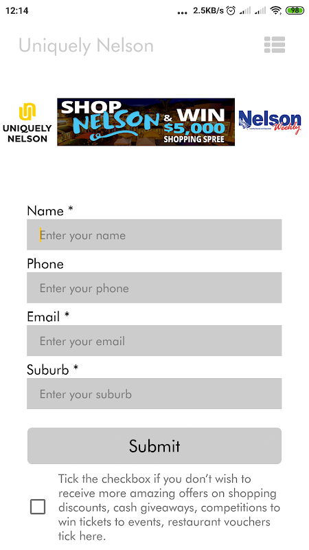 Uniquely Nelson can add participants for the competition through mobile application. The mobile application is simple to use and contains a form. With this mobile application, the competition creators can easily fill up the forms for the participants with name, phone number, email, and suburb. The data can be viewed, and exported to excel format further.