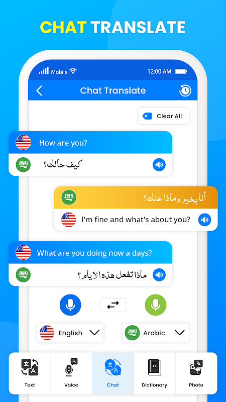 使用全语言翻译应用程序通过语音翻译将英语转换为阿拉伯语。语音翻译所有语言应用程序允许用户将多个语音文本从其母语转换为任何其他语言。只需对着麦克风说话,立即说话和翻译应用程序即可快速准确地将口语单词转换为多种语言。 All Language Translator Now 可帮助用户使用“说话和翻译”增强词汇量。语音翻译器提供一种特殊的方式翻译成所有语言。