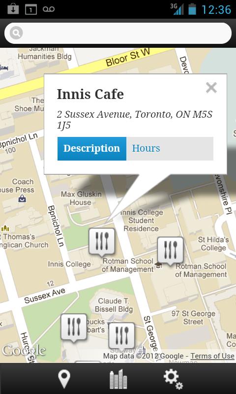 This Google-based, layered map designed for the Android helps members of the U of T community, particularly people who are new to the campus, navigate using meaningful search words, such as "library" and "registrar". The first map layers include accessibility, food, wireless, student services (including registrars), car parking, bike racks, TTC subway stations, green sites (including green roofs and battery drop-off sites), safety, study spaces and washrooms. It is a living map, one that will develop more layers as it grows.