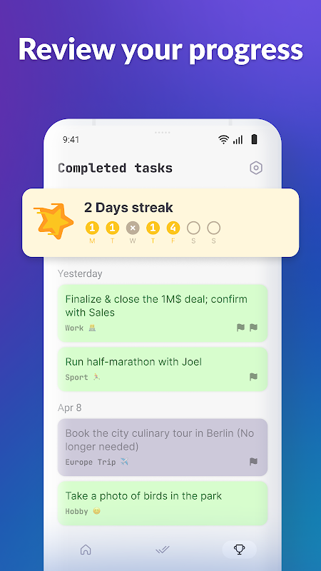 • 追踪进度:查看已完成的任务,记录连续完成的天数,保持动力。