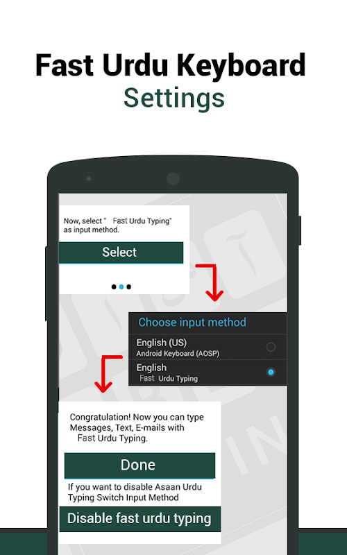 安装乌尔都语键盘的Android之后,你是自由的,按“启用键盘”及选择该键盘使用。这种键盘的工作原理,如打字/短信Android手机/平板电脑的默认键盘。只要输入英文和按空格键你的英语单词将自动转换成乌尔都语脚本。