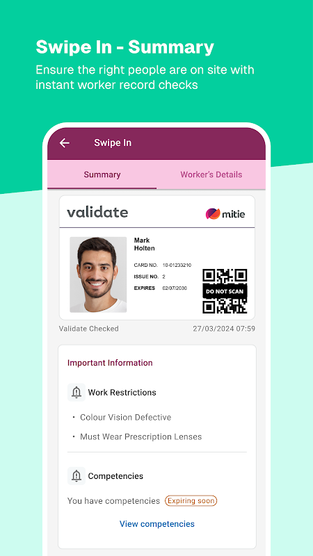 • 系统规则决定工人在现场工作的资格——刷卡时应用程序会实时检查这些规则,并突出显示是否有不符合条件的情况。然后可以审查相关员工记录以及即将到来的能力和其他到期情况。