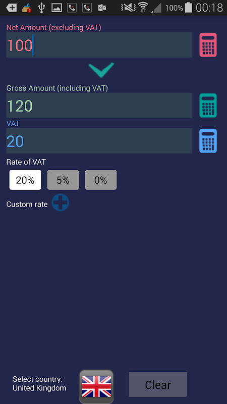 有了增值税计算器,你可以计算使用集成计算器。它可以检测到您所在的主要国家,而无需找到您自己的位置,它会自动显示默认设置的国家的通用费率,甚至可以存储和保存结果,选择的百分比,选择的国家。