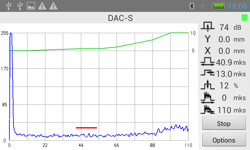 在手动模式下,显示探伤仪A扫描,展现在缺陷检查的操作回波信号发现,当前扫描参数,频闪信号放大和门,位置和时间延迟的最大信号。