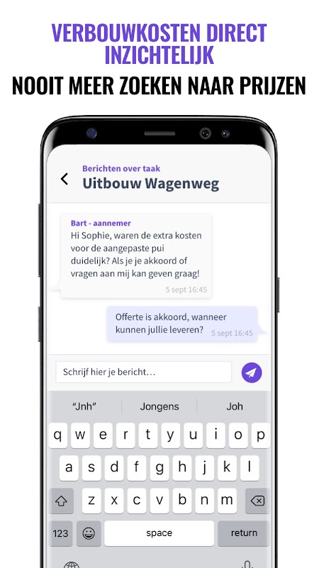 与您的装修团队聊天 - 避免不必要的电话和电子邮件,并将装修所需的一切都放在一个地方。您不再需要离开应用程序,即可让与您的装修相关的一切顺利顺利进行。您可以发送有关项目和特定任务/活动的消息。这样,每个人都确切地知道对他们的期望,并且没有更多的误解。您还可以安静地阅读所有内容,并且清楚地知道已达成或未达成的协议,从而将所有协议都记录下来。