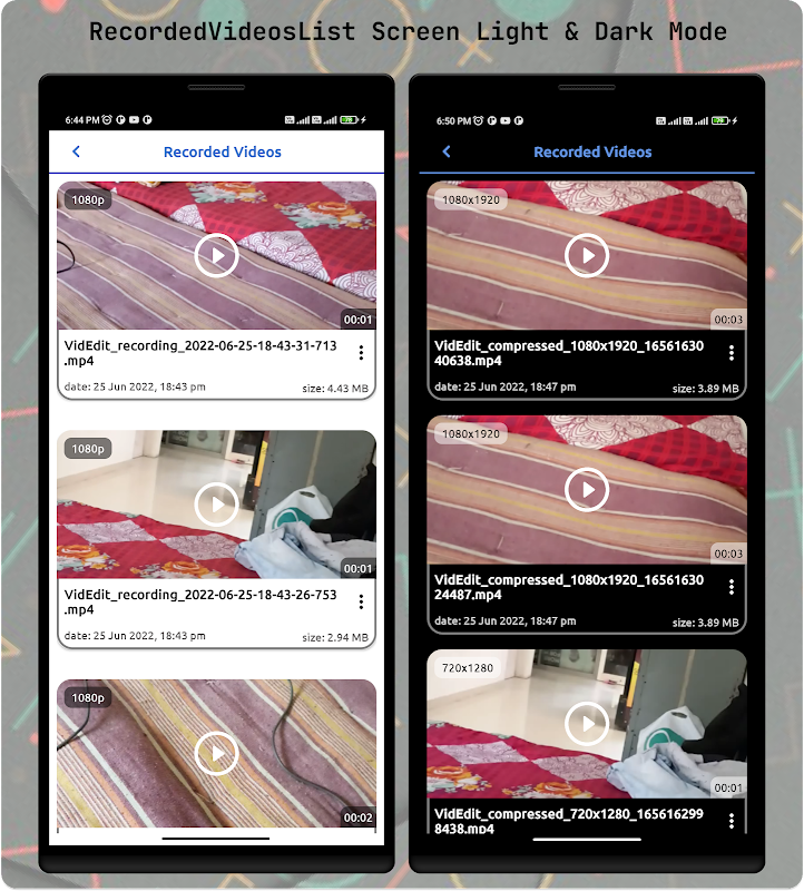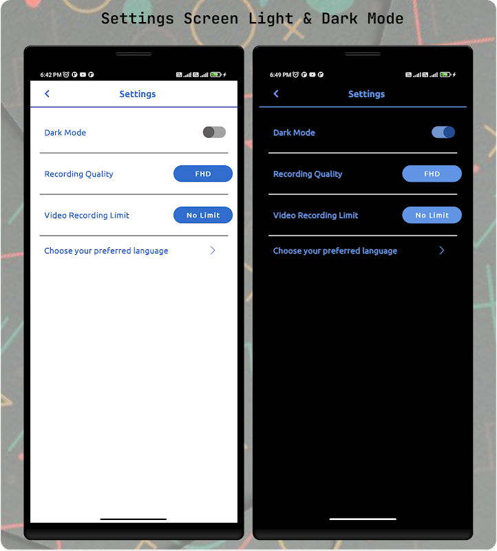 用户可以捕捉不同分辨率的视频并从内部存储中获取列表。用户可以使用时间线修剪此视频。用户可以在夜间使用我们的黑暗模式。它支持多种语言,我们将来会更多地支持语言。它还在设置中具有按大小选项的视频录制限制。您也可以使用我们的应用程序记录您的屏幕。这是一个开放的测试应用程序。我将来会在应用程序中添加视频和音频录制选项的压缩等功能。