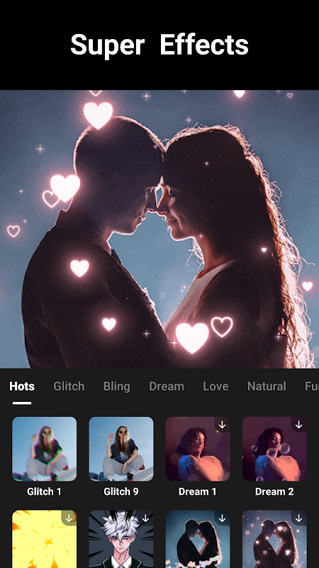 1.多种视频效果。 例如毛刺效果、分割、动态、爱情效果等等。 将您的视频提升到一个新的水平。