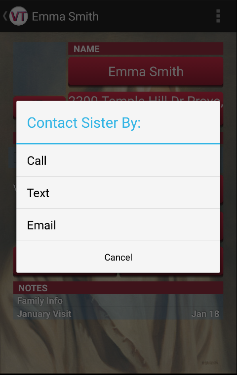 This app allows visiting teachers of The Church of Jesus Christ of Latter-Day Saints to keep all their information regarding visiting teaching in one convenient location. You can add as many women as you like to your visiting teaching list and save the necessary information. Call or text the sisters you visit teach from the app with a push of a button. Email a visiting teaching report to the person you report to. The email automatically gets filled in with info pulled from each individual sister's page so you don't have to write anything. You can add to or edit the email before it is sent if you would like though. This app is an easy way for LDS visiting teachers to keep track of their visits each month. We'd love to hear your feedback to know what you like, things you would like to see in the app, or if you experience any type of bugs or glitches in the app.