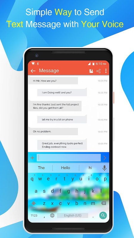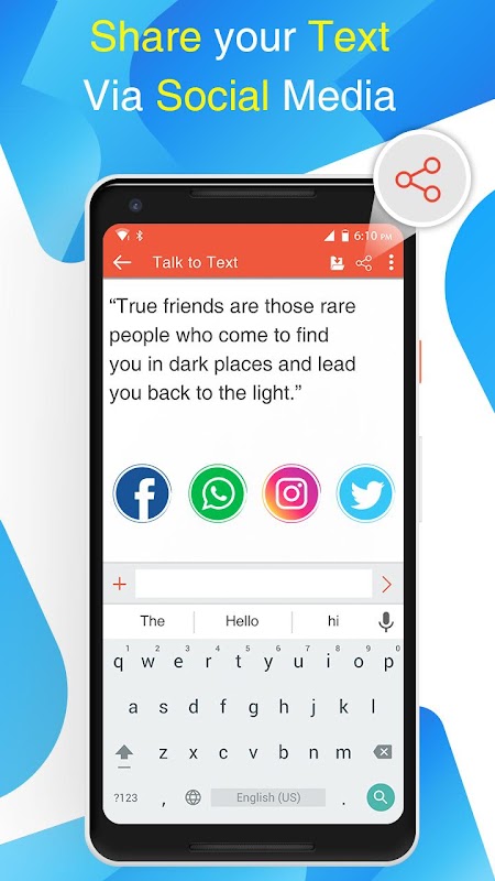 Voice typing is a simple app and user friendly application. The text appears after you done Talking. Once you get the regularity, you can use the app and send, share long texts and articles in other social media and many messaging application such as Watsapp, Viber, Skype etc. voice typing Supports more than 70 different languages.