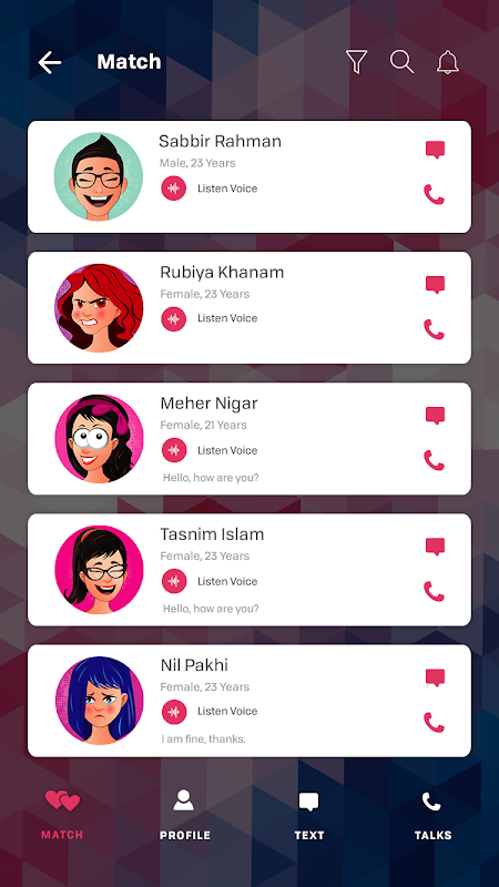 Voiceadda的美丽在于其使用的简易性和可用用户的多功能性。不管它是一个男/女,单身,老,年轻,睿智,聪明的,你就可以开始免费的语音通话或发送即时消息和查看其他用户是否急于说话。爱特尔Vioceadda带来的权利,你的愿望。它在你的指尖带来数以千计的匿名用户。你可以听他们的声音状态和他们交谈,而不共享您的身份。