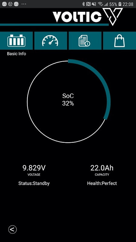 Voltic App通过蓝牙为电池提供电池信息,显示电量、电压、温度、实时电流等信息。