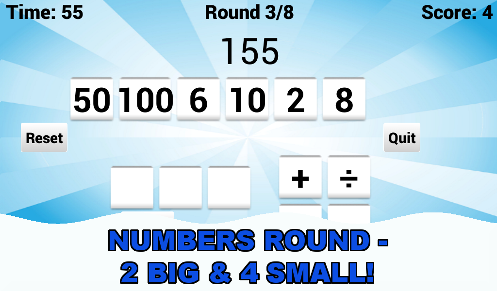 基于流行的倒计时电视游戏节目!选择元音和辅音,全天候测试您的英语语言技能!选择大数字和小数字,然后在时钟倒计时之前查看目标并解决数学难题!登录并在全球排行榜上发布您的分数,与世界各地的玩家比较您的高分!