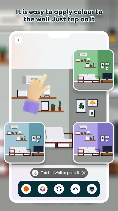 - 使用该应用程序虚拟地尝试墙壁上的不同颜色。点击墙壁以应用颜色并想象它在实际空间中的外观。