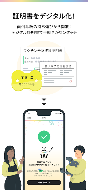 如果您提前在应用程序中注册了证书,您只需前往商店并使用应用程序扫描二维码即可提交狂犬病和疫苗接种证书。 *仅限支持Wan!Pass的商店