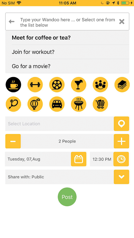 1. Wandoo shows you interesting people's intents/posts nearby, and allows you to post your intent.