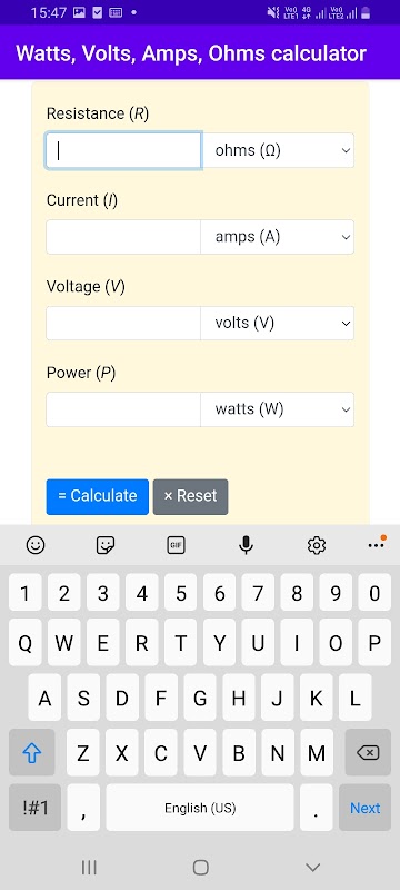 要使用此应用程序计算瓦特、伏特、安培和欧姆,您需要输入所有这些值中的任意两个值,然后点击计算按钮。一旦您点击计算按钮,该应用程序就会返回瓦特、伏特、安培和欧姆的两个值并显示答案。