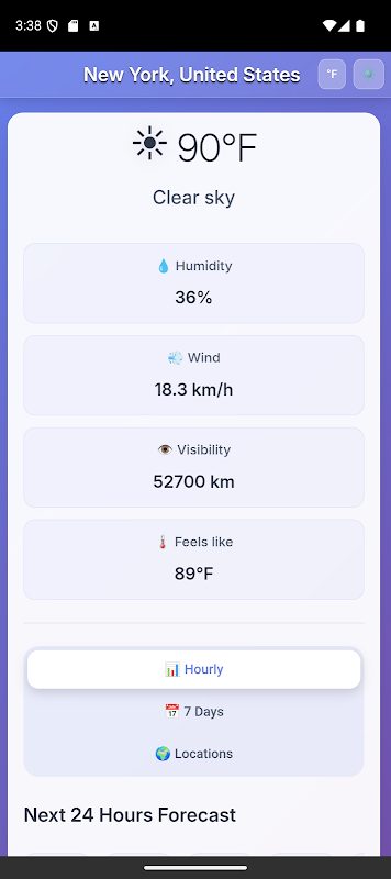 未来 24 小时的详细每小时预报,包含温度和天气状况
