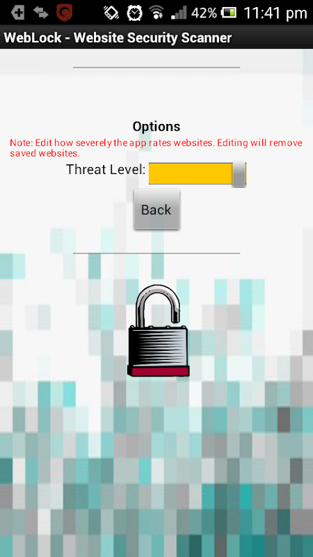 V2.8 Added an options menu that allows for the apps 'Threat Level' to be altered.
