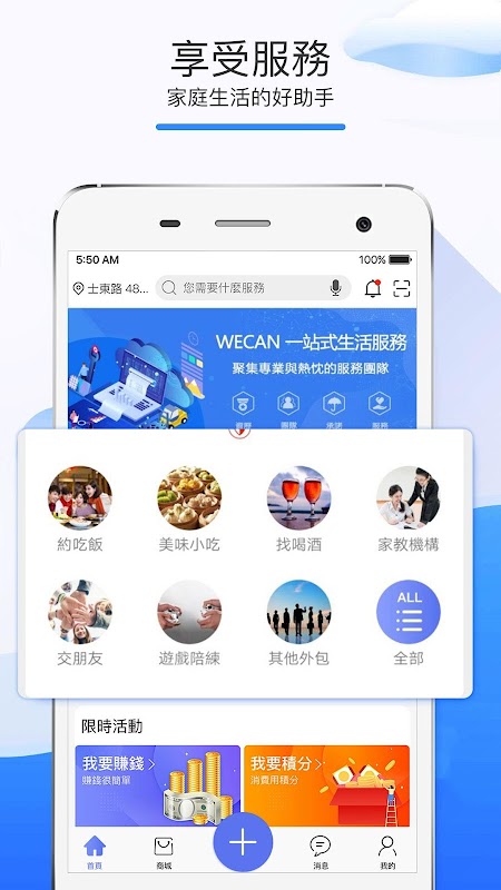 生活總是會遇到各種各樣的問題,為了幫助大家解決這些問題,所以WECAN誕生了,讓用戶更加方便搜尋及聯繫到附近可以幫忙你解決問題的專業人士,也拉進用戶和企業之間的距離,能更好的為您服務。WECAN還具備線上商城,讓你足不出戶,就可以方便購買到心中所屬。還在用傳統電話聯繫你的好友嗎?有了WECAN,雙方好友通過WECAN就可以免費電話了。還在用傳統的紙質名片嗎?有了WECAN,錄入你的專屬電子名片,讓更多的用戶或更多的合作夥伴發現你,還有更多有趣的地方,來等你發現噢!