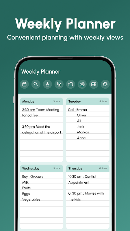 每周计划应用程序提供直观的界面,可帮助您有效地计划一周。通过可自定义的布局和提醒,您可以轻松跟踪约会、会议和个人任务。