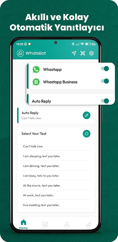 多亏了这个应用程序,您可以节省时间并让 WhatsBot 满足您繁重的电话流量。您可以下载并开始使用这款出色的应用程序,让您的生活更轻松。这款安全、创新且省时的自动回复应用程序可以成为您的新私人助理。我们的存在是为了让您的生活更轻松!