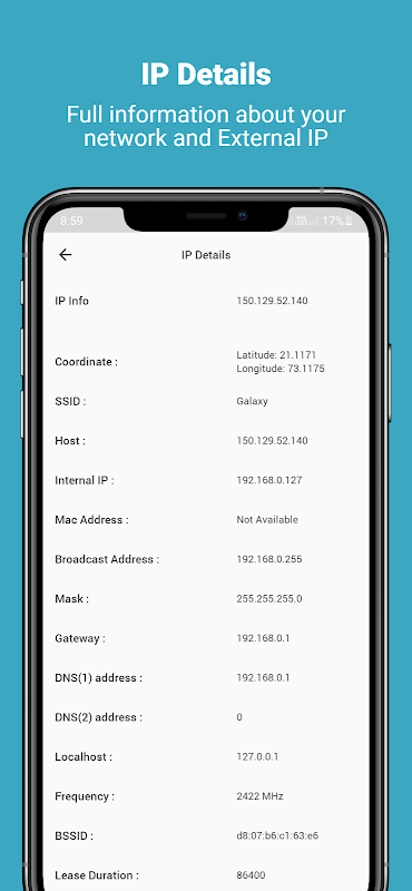 8. IP details - It provide network summary, host, latitude-longitude, wireless network type, status, name and IP address.