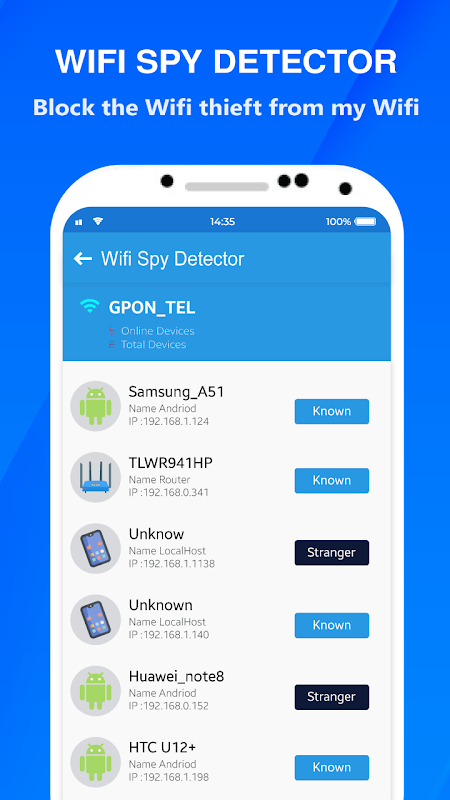 使用 WiFi Router Master 应用程序,您可以在几秒钟内知道有多少个设备以及哪个设备连接到您的无线路由器,并提供 IP、MAC 和供应商列表。