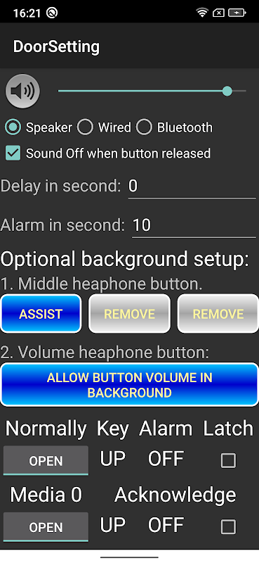 设置面板能够测试和调整警报传感器的状态。设置期间不拨打电话。最多可以将四个传感器连接到插孔连接器,但可用性可能因手机型号和 Android 版本而异。可选设置将有助于在手机锁定或睡眠时使用该功能。