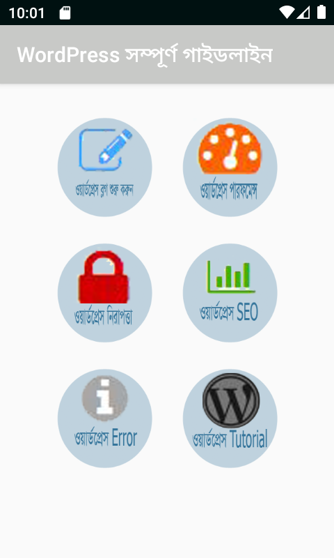 ওয়ার্ডপ্রেস বা ওয়েবসাইট সম্পর্কে যত রকম সমস্যার মুখোমুখি হন না কেন এই অ্যাপ এর মাধ্যমে তার সমাধাণের প্রক্রিয়া জানতে পারবে। অ্যাপটি খুবই সাধারণ সহজেই ব্যবহার করতে পারবেন। হোম পেজে মোট ছয়াট প্রধান মেনু রয়েছে। যথা-