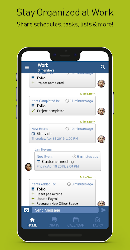 Create tasks and lists to manage everything that needs to be done. Tasks are automatically shared to other team member's devices and can be assigned, given due dates, repeated and more.