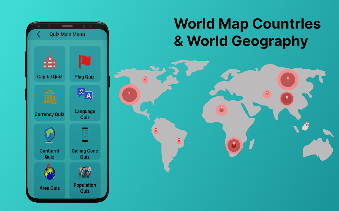 地理测验 - 世界地图测验有许多测验,包括首都测验,国旗测验,货币测验,语言测验,大陆测验,地图测验和国家代码,呼叫代码测验,人口测验和区域测验200多个不同的国家.