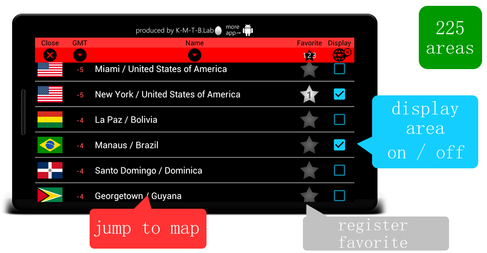 已注册区域将被添加已列出,时间通过触摸显示为从世界地图的数字时钟。