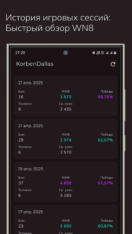 - 了解你最近一系列的战斗进展如何。该应用程序记录当前游戏会话的指标(WN8、伤害、胜利等),以便您将它们与平时的表现进行比较。