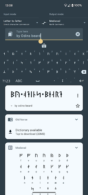 使用此应用程序,您可以根据与拉丁字母或西里尔字母的语音对应将文本音译为符文。这个应用程序翻译单词的声音,而不是意思。它是符文发音和学习符文字母的好来源。