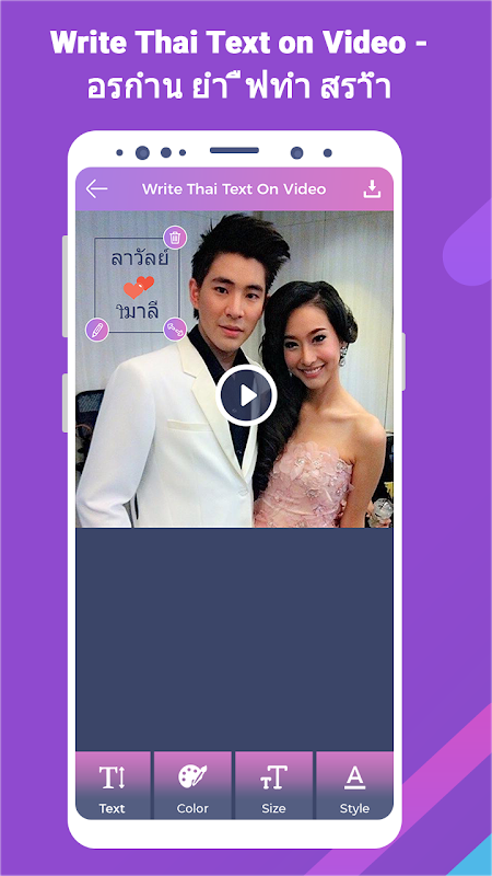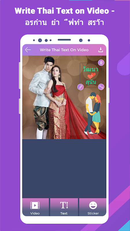 Write Thai Text on Video - Write Name On Video apps is the best app to add Thai text, artworks and stickers on photos.Write Thai Text on Video - Write Name On Video app allow you add romantic Thai text and Thai poetry on your gallery videos or on given rich collection of HD and stylish Background.this app allows you to write Thai text on videos. Write your own shayari, poetry, message, status etc on videos and share them with your friends.