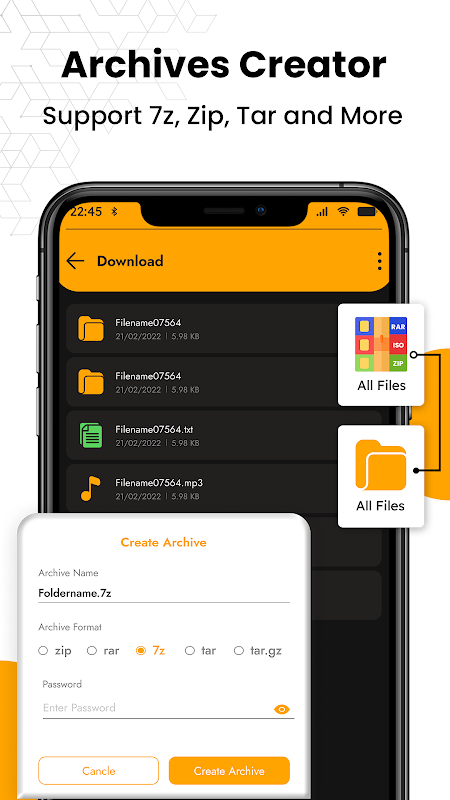Rar 查看器和 7 zip 文件存档所有格式,包括 7zip、jar、tar 和 rar 文件,并充当文件打开器和文件压缩器。