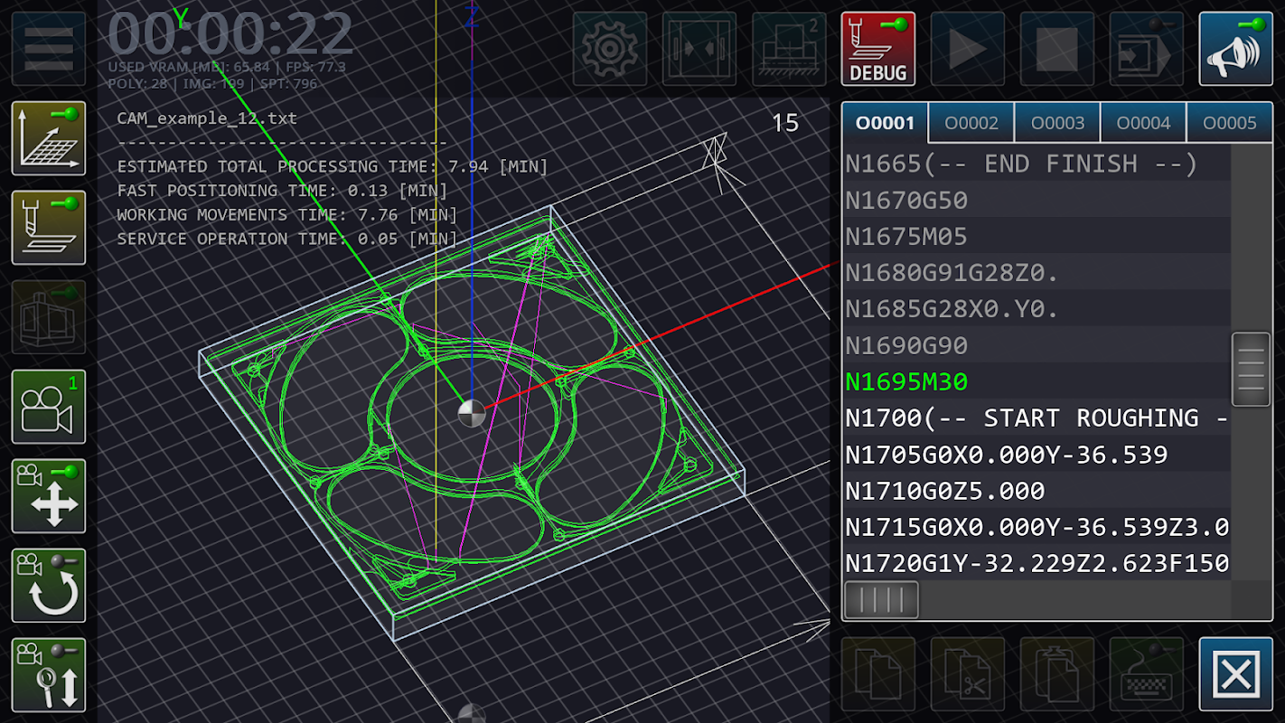 The main functions of the application: editing the code of the control programs of the milling machine, operations with files of control programs, setting the geometric parameters of the cutting tool, continuous/step-by-step execution of blocks of control programs, three-dimensional visualization of tool movements in the working space of the machine, simplified visualization of the machined surface of the part, calculation of processing modes, a quick reference guide to using G-code.